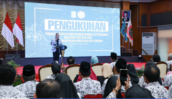 SurabayaHebat.com – Wali Kota Surabaya, Eri Cahyadi secara resmi mengukuhkan Pengurus Persatuan Guru Republik Indonesia (PGRI) Kota Surabaya masa bakti 2025–2030 di Graha Sawunggaling, Jumat (11/7/2025). Dalam kesempatan tersebut, Eri Cahyadi menegaskan pentingnya peran strategis guru dalam menyusun program pendidikan bersama Pemerintah Kota Surabaya.